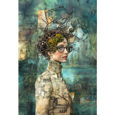 Una obra que fusiona naturaleza, historia y alma en un retrato onírico y poético. La serie “Mystic #01” nos transporta a un universo donde el rostro humano se entrelaza con paisajes montañosos, arquitectura antigua y texturas orgánicas como musgo y papel. Ideal para espacios que buscan arte con profundidad, sensibilidad y un toque de magia.